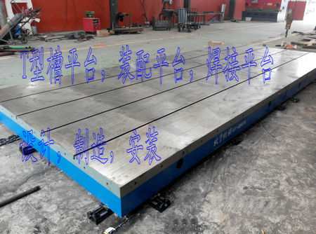 我公司為保定客戶生產(chǎn)的T型槽焊接平臺,2件2500*4000mm的T型槽平臺,拼接成2500*8000mm的焊接裝配平臺.表面帶有刻度線,間距200*200mm。應客戶要求在平臺周邊間距250mm均布M20的螺栓孔40個。